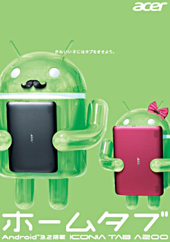 家庭で楽しめる新しいタブレットを「ホームタブ」と名づけ、Androidのキャラクターを親子に見立て、父親役にヒゲ、娘役にリボンをつけ、「ICONIA TAB A200」を抱くオリジナルグラフィックを作成。「かわいい子にはタブをさせよう」をテーマに、特設サイトでは、リビング、キッチンなど、四つのシーンで家族みんなで一緒に楽しめるタブレットの活用方法を紹介している。