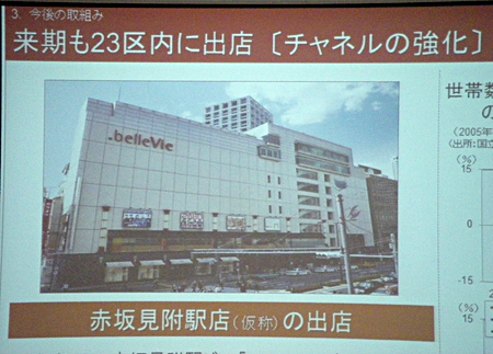 今後の出店計画では、今年7月に同社最大規模となる売り場面積1万5000m2の新宿店をオープンするほか、来年夏には東京メトロ赤坂見附駅ビル「.belleVie赤坂」に売り場面積約6000m2の店舗を開設する計画だ。
