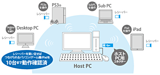 メインで使うPC(ホストPC)にUSBでコネクタを接続し、マウスとキーボードで、レシーバを接続した別のPCやゲーム機、iPadなどを操作することができる。レシーバを買い足せば、10台まで接続先が追加できる。通信距離は最大10m。ドライバのインストールは不要。