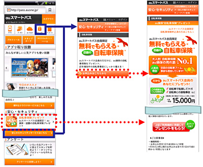 「auスマートパス」→「安心・セキュリティ」→「無料でもらえる自転車保険」の順にアクセスして申し込む(画面イメージ)