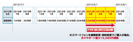 「ドコモ はじめてにねん割」が利用できる期間(2010年6月10日に新規契約した場合)