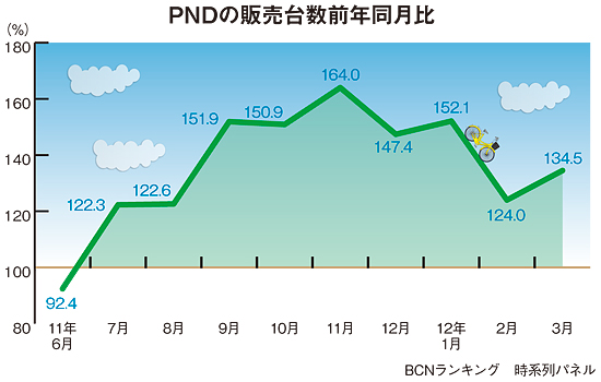 家電量販店の実売データを集計した「BCNランキング」によれば、PNDの販売台数は2011年6月が前年同月比92.4%。また、6月以前も前年割れが続いていた。ところが7月以降、この状況が急転する。