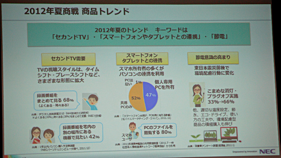 夏PCに搭載した新機能のコンセプトについて、コンシューマPC商品企画本部の栗山浩一本部長は、「『セカンドテレビ』『スマートフォン・タブレットとの連携』『節電意識の高まり』の三つの機能を強化した」と説明した。