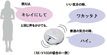 部屋をキレイにするロボット家電「COCOROBO」の上位モデル「RX-V100」は、人工知能「ココロエンジン」を搭載し、充電量や掃除の状況に応じて「気分」が変化し、多彩な反応が楽しめるほか、音声認識「ボイスコミュニケーション」機能によって、ユーザーの呼びかけに反応して、対話しながら操作することができる。本体の各種設定などの操作も音声ガイダンスがナビゲートし、簡単な挨拶もできる。