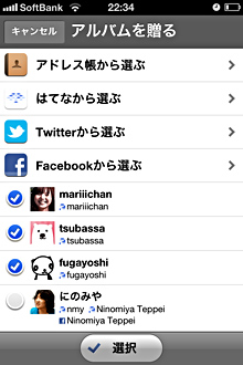 作成したアルバムはFacebookの友だち、Twitterで相互フォローしている人などに送ることができる