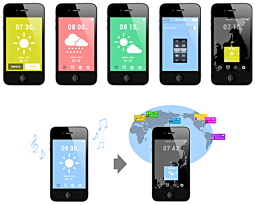 「毎日の目覚めを快適にしていく」をコンセプトにした目覚ましアプリ。天気・時刻・曜日に関する情報を収集し、オリジナルのアラームミュージックの自動再生や、GPSによる測位やリストで地域を選択することで現在の天気・気温を表示する機能を備える。