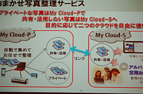 「My Cloud」は、家のなかに散在するデータをPCで統合・管理する「My Cloud-P」と、PCに保存したデータをウェブ上で活用するサービス「My Cloud-S」で構成する。