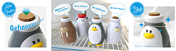 丸みを帯びた牛乳瓶デザインで、コルク素材の牛乳瓶の蓋を押すと、ゲップやくしゃみをして、その後に音声が止まる。サイズは、高さ77×幅48×奥行き48mmで、重さは約46g。ボタン電池(LR44)を3個使用する。