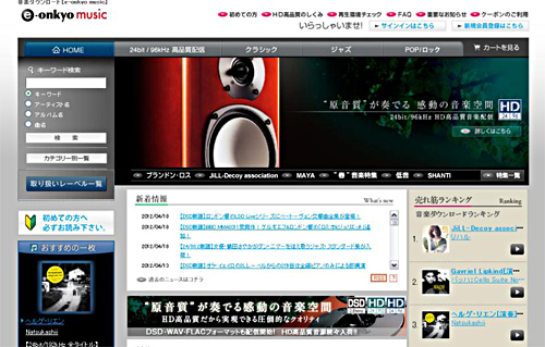 「e-onkyo music」は、2005年8月にスタートした高音質音楽配信サービス。10年にはDRM(デジタル著作権保護技術)フリーの音源、DSDフォーマット音源の配信、11年にはロックグループ「クイーン」のハイレゾ音源(CDを超える高音質)を世界で初めて配信するなど、ラインアップを拡大してきた。12年4月現在の配信楽曲数は約6万曲で、このうち24bit/96kHz以上の高品質楽曲は約1万5000曲。