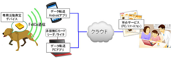 測定したデータは、デバイス内に一定期間蓄積。デバイス内のデータは、専用アプリケーションとFeliCa通信を使って、スマートフォンやPCで簡単に読み取ることができる。また、読み取ったデータを専用のクラウド上にアップロードし、保存することができる。クラウド上のデータは、飼い主専用のウェブページで閲覧でき、推移グラフでペットの活動変化を把握することができる。