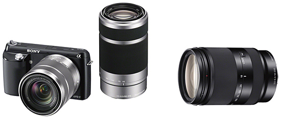 左から、NEX-F3 ダブルズームレンズキット(ブラック)、Eマウント用交換用レンズ「E 18-200mm F3.5-6.3 OSS LE」