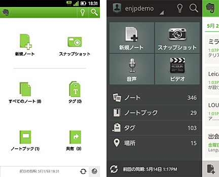 左が旧ホーム画面、右が「Evernote 4.0 for Android」のホーム画面