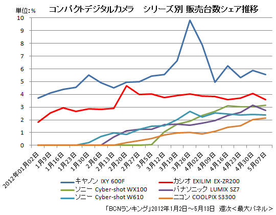 2012年前半は好調にシェアを伸ばしたカシオ。しかし、業界1位のキヤノンを始め、新製品を投入したソニーやニコンもシェアを伸ばしつつある。今後の市場の動向に注目したい。(BCN・山下彰子)
