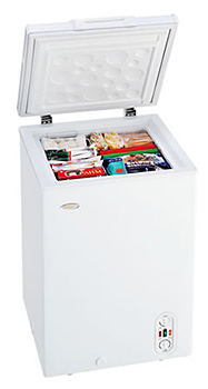 上開き式扉は冷気が逃げにくく、電力のムダ遣いを極力減らすことができる。年間消費電力量は240kWhで、家庭用上開き式冷凍庫の100Lクラスで省エネNo.1を達成した。運転音は約25dBの静音設計。