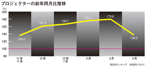実際、家電量販店の実売データを集計した「BCNランキング」で昨年11月から今年4月までの販売台数前年同月比をみると、11月が136.3%、12月に161.4%と伸びている。今年に入ってからは、1月に166.7%と成長を維持し、2月に176.0%、3月には179.8%まで伸びている。4月は138.2%と少し落ち着いたもののボリュームは維持している。地デジ移行後、低迷が続く薄型テレビと対を成すような好調ぶりで、テレビを買い増す感覚でプロジェクターを購入する人が多くなっていることがうかがえる。