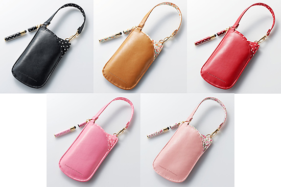 「P-01CCGシリーズ」は、スマートフォン本体にぴったりとフィットするスリムデザインの女性向けハンドルつきポーチ。表地の素材は高級感のあるソフトレザーで、ブラック、キャメル、レッド、ピンク、パステルピンクの5色が揃う。ブラック、ピンク、レッドの裏地は水玉柄、キャメルとパステルピンクは花柄。