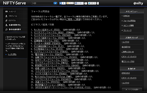 今回は、当時のフォーラムに「参加していた」ボタンで自分のハンドルネームを登録し、発言やコメントができる「フォーラム同窓会」、思い出やエピソードを語り合う掲示板「エピソード募集」、ノージャンルの掲示板「フリートーク」、ハンドルネームでメッセージをやりとりする「メッセージ」、Facebookでつながっている友だちを招待できる「友達を招待する」の5種類のサービスを提供する。