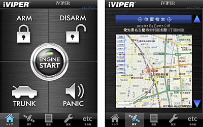 自動車盗難防止装置「VIPER」と、通信ユニット「NEW iVIPER」を車両に取りつけて、iPhoneのブラウザから専用サイトにログインすることで、iPhoneで車両のロックやアンロック、車両の居場所を地図で確認できる。