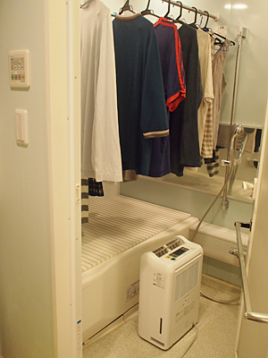 ちなみに、取扱説明書では水濡れ防止のために浴室内での使用は禁止されているが、三菱のお客さま相談センターに問い合わせたところ、床面が濡れておらず、天井から水滴が落ちてこない乾燥した状態であれば、使っても問題ないという回答だった。浴室は狭いので、しっかり締め切って除湿機を使えばより早く洗濯物が乾くはずだ。