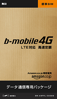 Amazon.co.jp限定販売の高速定額データ通信サービス用のSIMパッケージ。「b-mobile4G アマゾン限定 高速定額」として、標準SIMサイズの「BM-AMFRL-500MB」、マイクロSIMサイズの「BM-AMFRL-500MBM」をラインアップする。価格は、500MB/月のデータ通信料1980円込みで3150円。スマートフォンなど、対応端末にSIMカードを挿入すると、NTTドコモのモバイルネットワークを利用した高速なLTEまたは3Gでデータ通信を行うことができる。