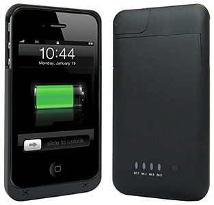 1900mAhのリチウムポリマーバッテリを内蔵したiPhone 4S/4用ケース。FMトランスミッタ機能に切り替える「FMモード」にすると、カーステレオや自宅などのラジオを通してiPhoneの音楽を聞くことができる。「充電モード」にすると、iPhoneで動画や音楽再生、通話ができる。
