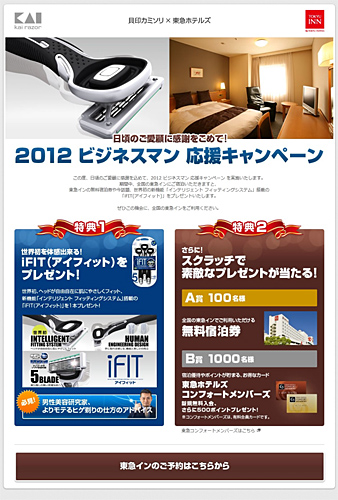 全国主要都市の駅前に展開するビジネスホテル「東急イン」に宿泊すると、フロントでもれなく「iFIT」と、プレゼントが当たるキャンペーンスクラッチカードを進呈。「東急イン」無料宿泊券が100名に、有料会員制度「コンフォートメンバーズ」の新規無料入会+500ポイントが1000名に当たる。