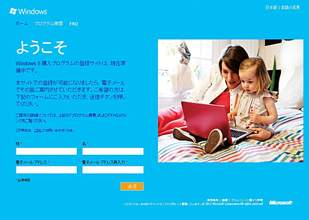 「Windows 8優待購入プログラム」のウェブページ(6月4日12時の段階では準備中)
