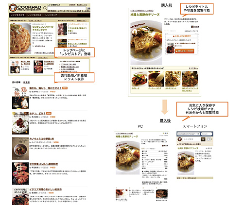 ユーザーが購入したレシピは、「クックパッド」の通常のレシピフォーマットで表示する。通常のレシピ閲覧サービスと同じく、お気に入り保存やレシピ検索などができる。