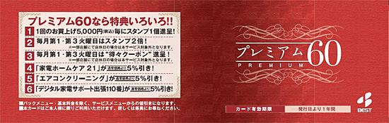 「プレミアム60カード」に、1回の税込み購入金額が5000円ごとに、スタンプを1個押印。スタンプが10個貯まると、1回の税込みが購入金額3万円以上の買い物の際に、3000円の値引きクーポン券として利用できる。また、第1・第3火曜日はスタンプが2倍になるほか、消耗品や家電小物が割引きになるクーポン券「得々クーポン券」をもれなく進呈する。