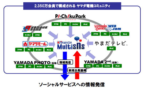 「ヤマダ電機マルチSNS」は、既存のデジタル・家電製品の通販サイト「ヤマダデンキウェブドットコム」、衣料品や日用品雑貨などを揃えるインターネットショッピングモール「ヤマダモール」、購入者による口コミサイト「ピーチクパーク」に加え、Android搭載スマートフォンと従来型携帯電話向けのゲームを提供する「ヤマダゲーム」、ビデオオンデマンドなどが利用できる「やまだテレビ」、写真コミュニティサイト「ヤマダフォト」(仮称)、中古品の買取りや販売を行う「ヤマダセカンド」(仮称)の四つの新サービスを統合して提供する。