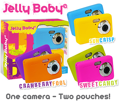 「Jelly baby」は、スケルトンの本体にシリコンカバーの着せ替えができる。2.7インチ液晶モニタ、500万画素CMOSセンサ、4倍デジタルズーム機能を備えるほか、「オート」「風景」「ポートレート」「夜景」「夜景ポートレート」「高感度」「ビーチ」の撮影モードが選べる。記録メディアは、32MBの内蔵メモリとSDカード。着せ替えカバーは、ポップなカラーの2色セットを3種類ラインアップする。ブルーとイエロー「SUN CRISP」、ピンクとグリーン「SWEET CANDY」、パープル/オレンジ「CRANBERRY FOOL」から選べる。サイズは95.0×600.0×25.0mmで、重さは100g。