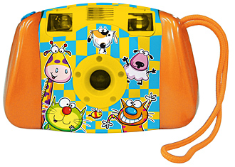 「KIDDY PIX」は、小さな両手でしっかり握ることができる幼児向け。300万画素CMOSセンサを搭載する。両目でのぞくことができるファインダーや、電池の誤飲を防止するバッテリカバーがついている。記録メディアはDカード。サイズは90.0×139.0×52.0mmで、重さは165g。対象年齢は3歳以上。