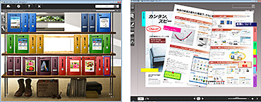 「楽2ライブラリSmart」は、紙文書や電子データ、写真を手軽に整理・整頓できるソフト。実際の書棚を再現したデザインで、書棚上でバインダーの表紙を見せて配置することで、すばやく目的のファイルを見つけられる。画面左の大型メニューアイコンで、操作が簡単。紙の文書は、ドキュメントスキャナ「ScanSnap」からワンプッシュで取り込むことができる。