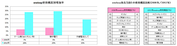 左から、「エネループ」使用機器別増加率、使用機器の比較(06年と12年)