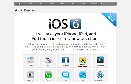 Apple(アップル)は、6月12日、一新したマップなど、200以上の新機能を搭載したモバイルOSの最新版「iOS 6」をプレビューし、iOSデベロッパプログラムのメンバーにベータ版をリリースした。iPhone 4S/4、iPhone 3GS、新しいiPad、iPad 2、第4世代iPod touch向けに、今秋、無償のソフトウェアアップデートとして提供する。なお、現行のiOS 5とは異なり、2010年発売のiPad(第1世代iPad)、第3世代iPod touchは対象外となる。