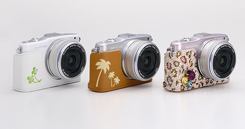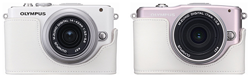 「オリジナルホワイトボディージャケット」。左は「OLYMPUS PEN Lite E-PL3」のホワイトボディに、右は「OLYMPUS PEN mini E-PM1」のピンクボディに装着した場合のイメージ