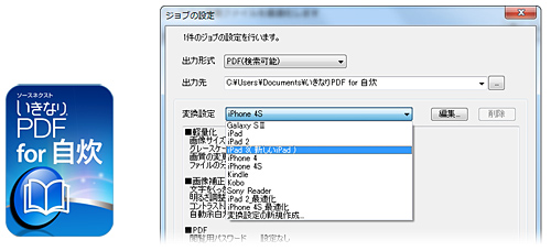 “自炊”したPDFやJPEGファイルを、iPadなどのタブレット端末やiPhoneやAndroid搭載スマートフォンに合わせて最適化する。ドラッグ&ドロップで最適化するファイルを登録して、出力形式(PDFまたはJPEG形式)とデータを使用する機器(タブレット端末やスマートフォン)を選ぶだけだ。