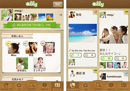 「ally」は、PC、スマートフォン向けに提供している写真共有サービス。スマートフォンアプリのバージョンアップでは、投稿するカテゴリを「食べた」「行った」「買った」「思った」「聴いた」から選ぶようにした。また、iPhone版に写真に音楽をつけて投稿・試聴する機能を追加した。Android版は試聴だけに対応する。