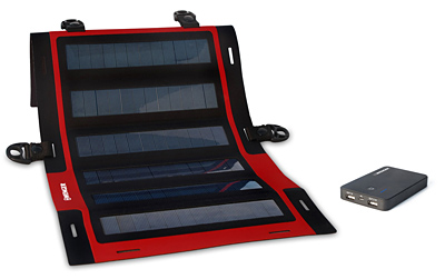 多結晶シリコンソーラーパネルと5000mAhの大容量蓄電池のセット。ソーラーパネルは特殊な加工技術によってナイロン素材のレイヤーに組み込んでいるので柔軟性に富み、付属コードでザックやテントなどに取りつけることができる。防水/防塵性が高く、アウトドア環境での利用に適している。大容量蓄電池は、スマートフォンの場合、約3.5回分充電できる。USB出力端子×2を備える。