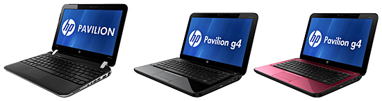 「HP Pavilion dm1-4200 AMDモデル」(左)と「HP Pavilion g4-2000」(中、右)