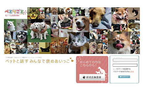 ペットコミュニティSNS「ぺとりごと」のトップページ