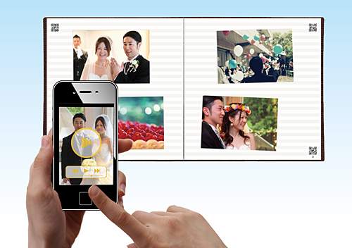写真を貼る台紙の各ページに、アプリ読み取り用の専用コード(QRコード)をつけたアルバム。従来の紙のフォトアルバムでは納まりきらない複数の写真や動画を、専用アプリ「VIEWBUM App」をインストールした手持ちのスマートフォンで見ることができる。