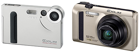 初代EXILIMの「EX-S1」(左)と最新モデル「EX-ZR300」
