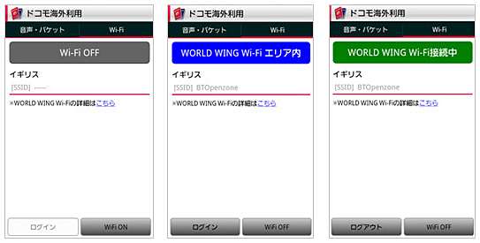 「ドコモ海外利用」アプリの画面イメージ。左から「Wi-Fi機能オフ時」「エリア内未接続時」「接続時」