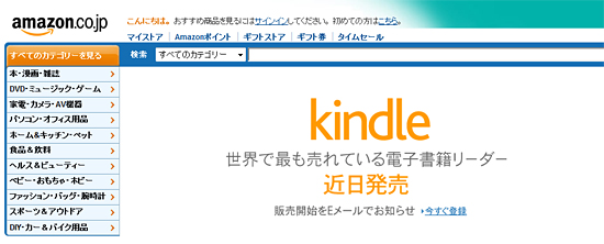 総合オンラインストアのAmazon.co.jpは、ストアのトップページと「本」カテゴリのトップページに、電子書籍リーダー「Kindle(キンドル)」を近日発売するという告知を掲載した。販売開始を知らせるEメールの登録を受け付けている。