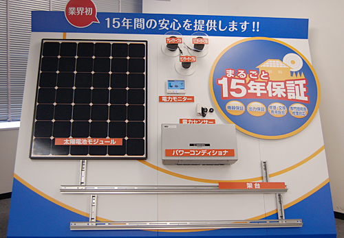 「まるごと15年保証」は、太陽電池モジュール、モジュールを屋根に取りつける架台、パワーコンディショナー、電力センサなど、システムに必要な機器すべてが保証の対象になる。また、出力状態をインターネットを通じて見守る「webモニタリングサービス」を無料でつける。万が一、システムに異常があった場合にはシャープにエラー情報が届き、シャープからユーザーへ連絡が行くので、ユーザーは常に監視している必要がなくなる。