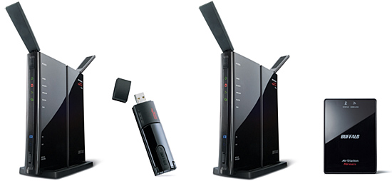 「WZR-300HP/U」は、IEEE802.11b/g/nに準拠した通信速度300Mbps(規格値)の無線LANルータ「WZR-300HP」と、USB 2.0接続の子機「WLI-UC-G300HP」のセット。7月中旬の発売で、税別価格は1万2200円。「WZR-300HP/E」は、「WZR-300HP」とLAN端子用の子機「WLAE-AG300N」のセット。8月中旬の発売で、税別価格は1万5300円。