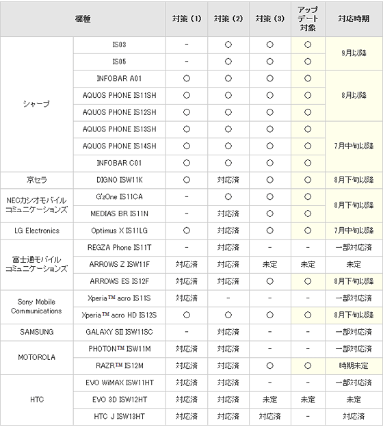 ソフトウェアアップデートの対象機種は、INFOBAR A01、INFOBAR C01、AQUOS PHONE IS11SH/12SH/13SH/14SH、IS03、IS05、DIGNO ISW11K、G'zOne IS11CA、ARROWS ES IS12F、Xperia acro HD IS12Sなど。機種によって、対策内容・対応時期が異なり、7月中旬以降に順次提供する。一部の機種は三つの強化ポイントの一部にすでに対応済み。なお、ソフトウェアアップデートは最新OSが対象なので、事前に最新OSにアップデートするよう呼びかけている。