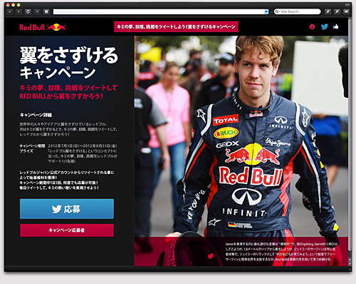 「翼をさずけるキャンペーン」は、期間中にブランド・スローガン「レッドブル翼をさずける」のテーマに合った夢や目標、挑戦をTwitterのツイートで受け付け、1日に1~2つを選考。期間中に選んだツイートの中から最終審査で1名を選び、その夢の実現を同社がサポートする。
