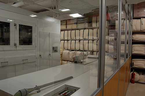 「加工工房」はガラス貼りで、羽毛布団ができあがる様子を見ることができる